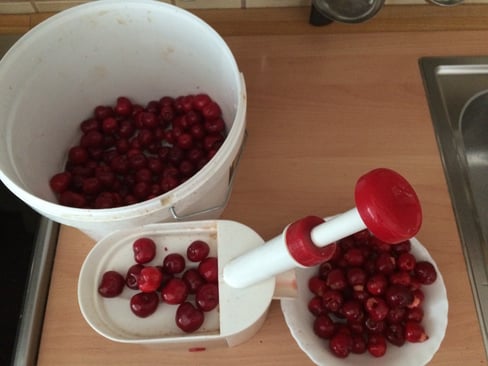 種を抜いたさくらんぼはケーキその他の材料に使うとのこと。